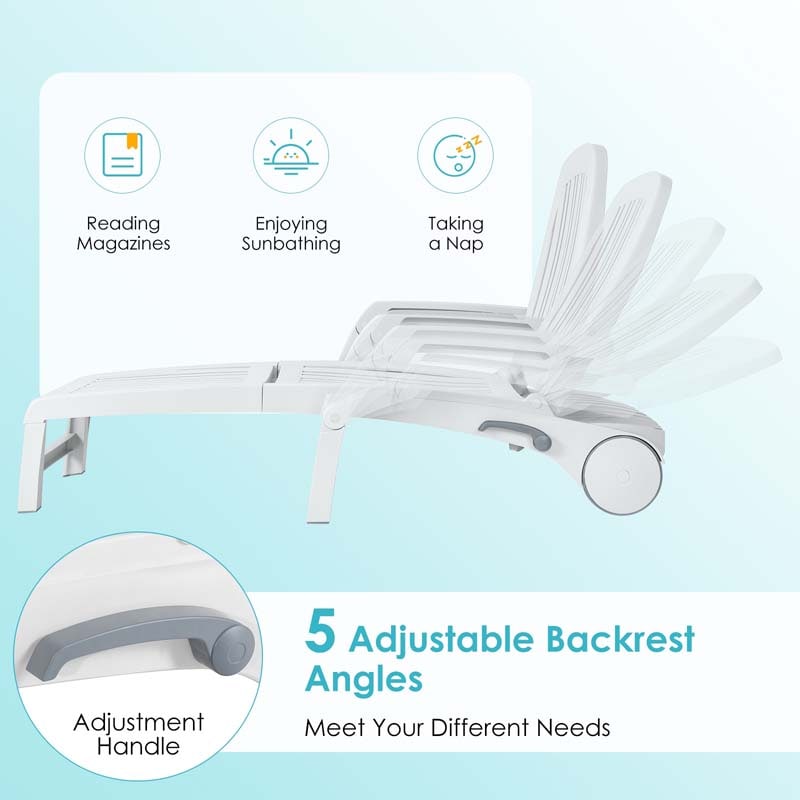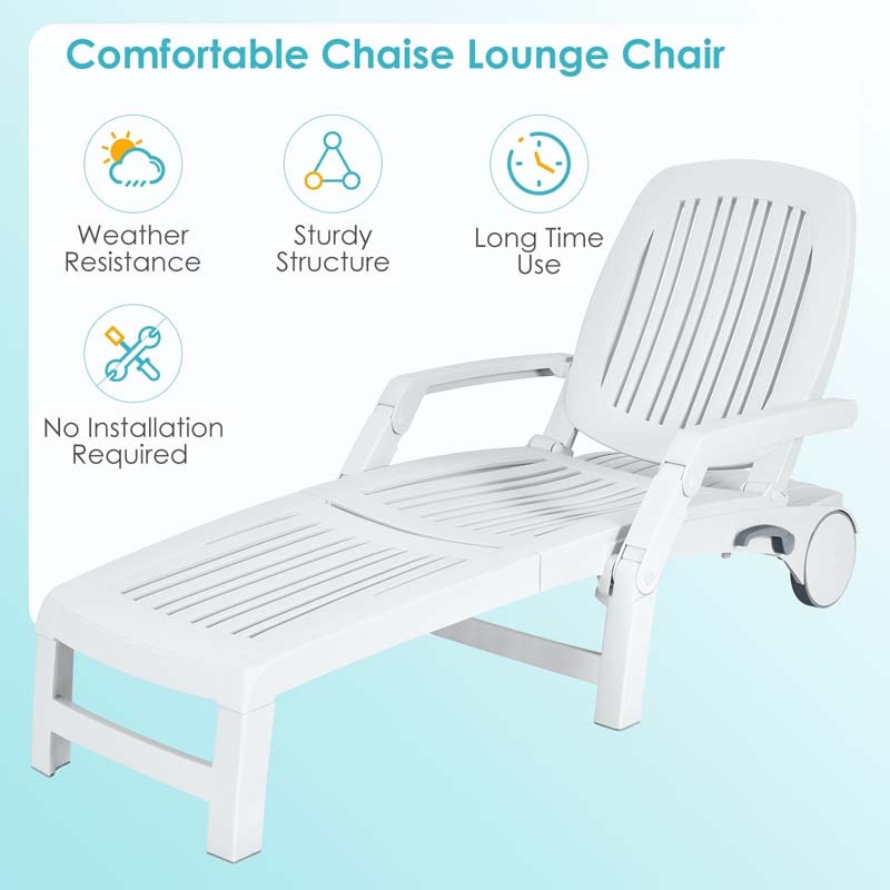 Weatherproof Folding Sun Lounger with Wheels, 6-Position Plastic Outdoor Chaise Lounge Chair for Pool Beach Lawn