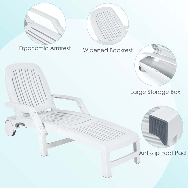 This folding sun lounger is designed to save space and offer comfortable relaxation. The backrest adjusts to six angles, allowing you to find the most comfortable position for reading, resting, or sunbathing. With a no-assembly-needed design, it saves time and effort. The stable triangular structure supports up to 330 lbs, while the lightweight design with built-in wheels makes it easy to move around. Made from weather-resistant PP material, it performs well in both sun and rain. A built-in storage box on the back offers space for small items like towels or books. With a clean and modern look, this lounger enhances your outdoor area, whether by the pool, in the backyard, or on the patio.